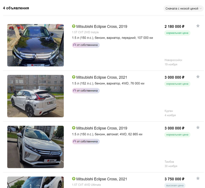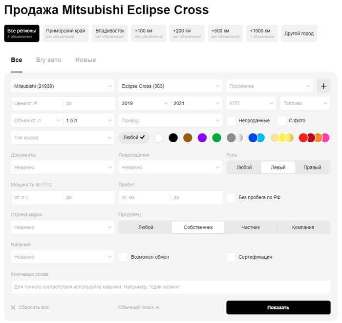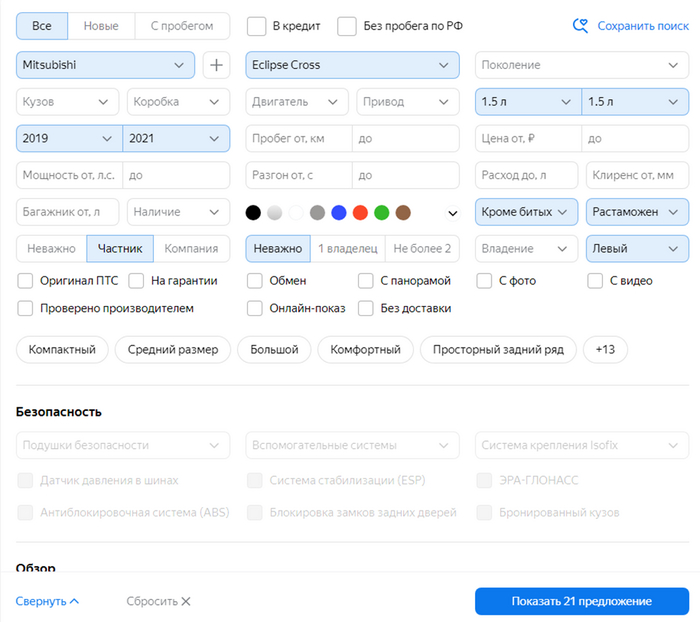 Фильтры: возраст авто 2019-2021 год, объем 1.5 литра, левый руль, предложение от собственника, сортировка по цене от низкой.