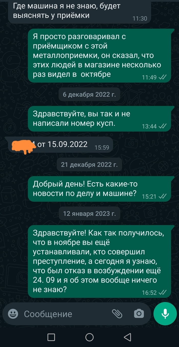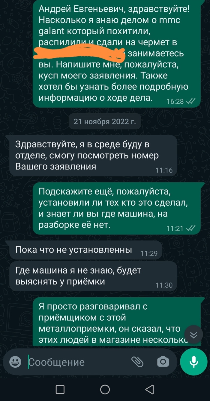 Дело было в сентябре, 15го... В октябре, я пытался связаться с опером, который ведёт дело, дежурный позвонил ему по личному телефону, тот ответил, что ещё разбирается, дал мне его рабочий номер(не разу никто трубку не поднял), в ноябре я всех задолбал в дежурке, и мне дали его личный номер( ни разу ска не поднял трубку), писал только в вотсап, что устанавливает, кто машину спёр, и где машина(она уже сибаста с приёмки в это время) будет узнавать.
