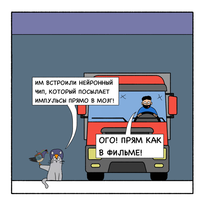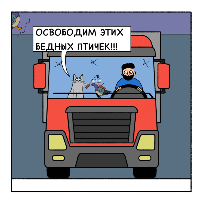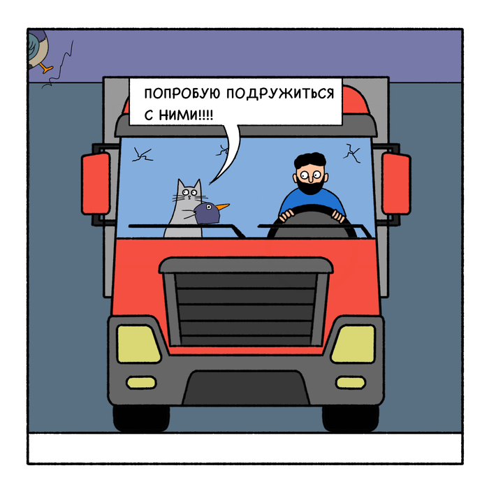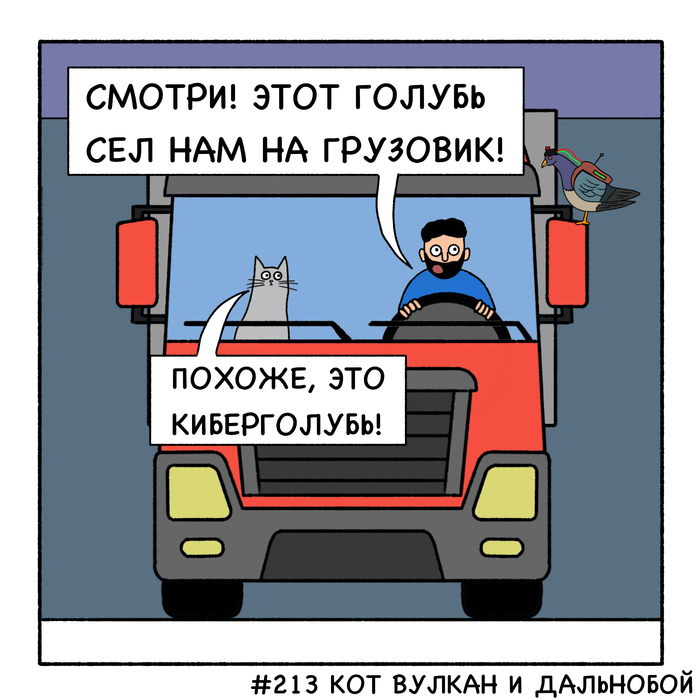 Кот Вулкан и дальнобой едут далеко-далеко. В дороге дальнобоя развлекает очень эрудированный и умный кот Вулкан.