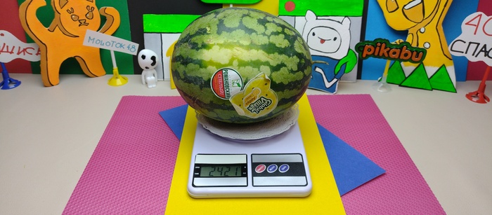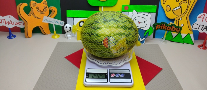 Честно говоря у меня уже потекли слюни как у моей бывшей , так сильно мне захотелось отведать сладкого и сочного арбузика, но для начала надо его взвесить и вместе с сеткой он весит 2425 грамм