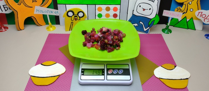 и если прочитать внимательно то самого винегрета должно быть 160 грамм ,так ли это узнаем вывалив всё на весы и какого же было моё разочарование увидев на весах цифру всего 148 грамм !!! Значит нас обманули на 12 грамм.