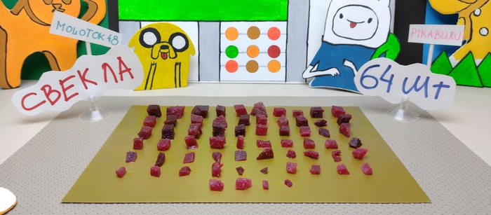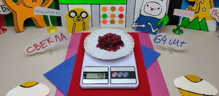 Первое впечатление конечно было испорчено попыткой обмануть меня с размером заявленной порции и поэтому я решил как можно тщательней изучить содержимое овощного салата которого у нас принято называть винегрет. И начну я пожалуй с того что сразу бросается в глаза а именно свёкла ! Её у нас как оказалось 64 кусочка
