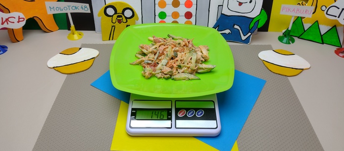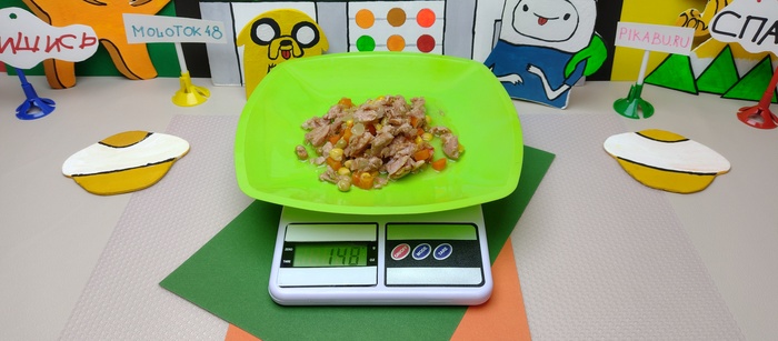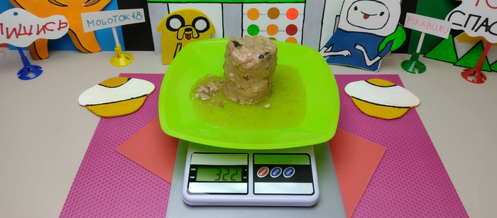 Несмотря на всю его герметичность открывается он довольно легко и без посторонних предметов что немаловажно в космическом путешествии где нет возможности брать с собой постоянно консервный нож !После вскрытия сразу же вываливаем содержимое пакета прямо в таз и ставим на весы чтобы узнать что общий вес продукта составляет 340 грамм.