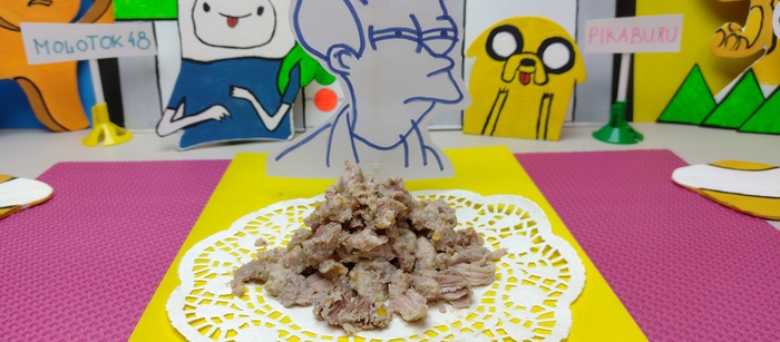 Но мне стало немного подозрительно что за такую цену внутри может быть мясо и я более детально взглянул на кусочки и там действительно были волокна плоти,правда вопрос чьей ?