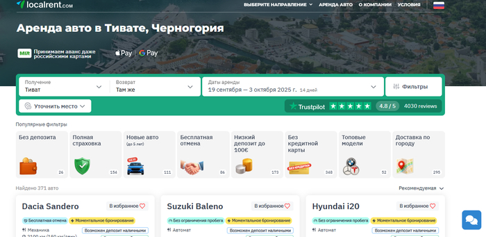 Localrent крепко держится в моём личном топе, потому что строит мост между путешественником и проверенными локальными прокатами. Это не абстрактный агрегатор, а площадка, где условия видны до копейки: депозит, франшиза, политика топлива (обычно «полный–полный»), лимиты пробега, условия для молодых водителей. Я не раз получал авто прямо у апартаментов в Будве или у стойки прилёта в Тивате — без квеста «найди наш офис по скриншоту в мессенджере».
