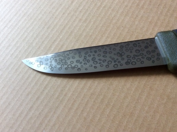 решил протравить клинок от годовалой моры из углеродистой стали, не то чтобы совсем от безделья, но поднадело что на углеродках появляется коррозия, а тут как то можно подзабить и не обращать внимания... спирт, горчица и 10 минут ожидания)