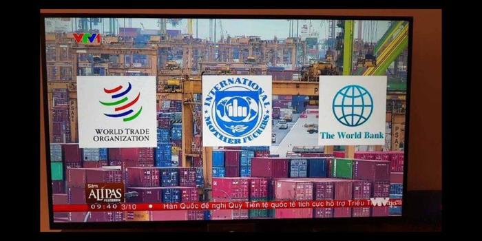 Был репортаж про конференцию МВФ(Международный Валютный Фонд) и ВБ (всемирный банк) В репортаже техник, который делал видео, должен был взять лого IMF ( international monetary fund) А вместо этого взял лого INTERNATIONAL MOTHER FUCKERS и все это пошло в эфир.