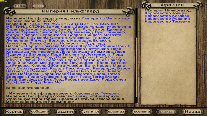 5 крупных фракций: Темерия, Редания, Каэдвен, Аэдирн и Империя Нильфгаард. Северные королевства слабы а Империя сильна у нее больше всего поселений и лордов(Империя агрессор, Темерия обычно исчезает первой за 150 дней)