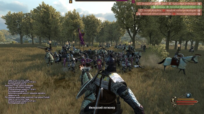С индивидуальной всё просто – мы можем наносить обычные атаки в одну из трёх плоскостей, колоть, пинать ногой. Есть блок оружием, есть блок щитом, обычные копья могут только колоть, из луков и арбалетов можно стрелять, слегка приближая экран. Вот, собственно, и всё.