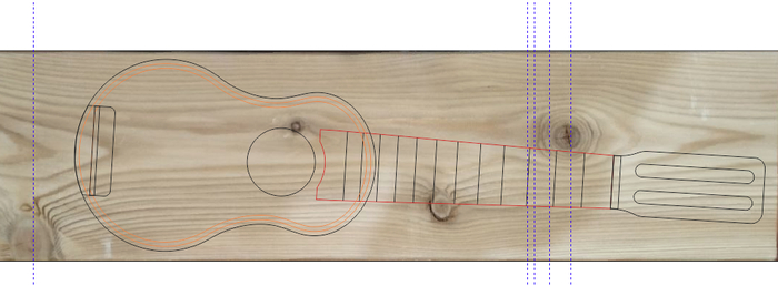 Задача была такова - сделать укулеле чуть меньше, чем сопрано по длине, чтобы влезала в обычный рюкзак. А так как мензуру я менять не хотел, то я просто сдвинул деку до самого нижнего порожка в сторону грифа. У меня были обрезки доски лиственницы 140х20 мм разной длины, посему ширина деки должна была туда влезать. Я решил вырезать гриф и верхнюю деку из цельного куска, потом обечайку тоже цельной и нижнюю деку тоже в форме крышки. Все должно садиться на пазы и склеиваться.