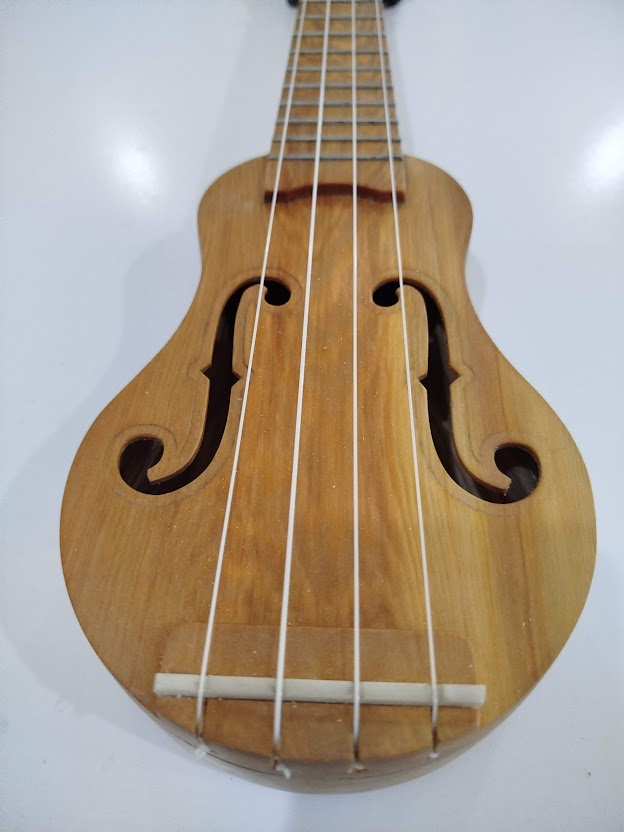 Дека стала у́же и я боялся, что на участке круглого отверстия инструмент будет перекашиваться и я сделал в этом месте продольные "пружины" в корпусе верхней деки, а отверстия сделал по бокам не круглыми, а "эфы" как на скрипке.