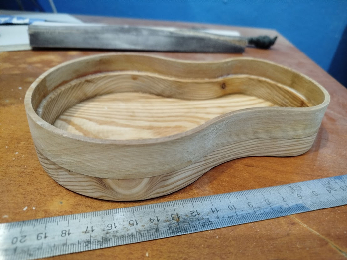Нижняя дека вырезалась с первого раза и хоть и нижняя стенка получилась довольно тонкой (около 2мм) я ее оставил. Пробовал усилить пропитав ПВА, но ее начало коробить волнами, высушил на батарее обратно, повезло, не треснула. Обечайка с первого раза раскололась, я просто вырезал контур толщиной 3мм который бы одевался на паз нижней деки. Вторая вырезалась целой, но все равно треснула при надевании, в третий раз резать не захотелось и я заклеил трещину цианоакрилатом.