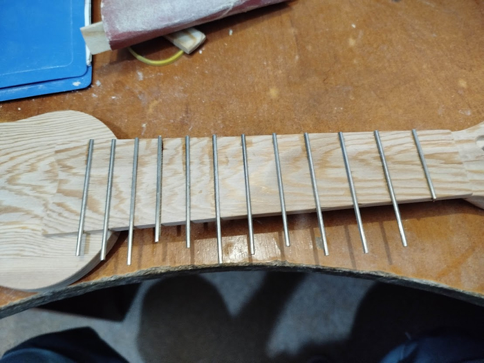 Лады я приклеил на цианоакрилат и долго шлифовал наждачкой наклееной на брусок, чтобы они были ровные и не царапали руку.