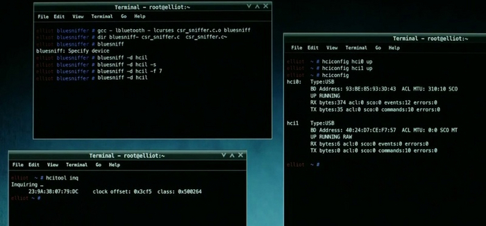 И хотя большинство хакерских способов взлома остаются дистанционными. Хотя Mr Robot, будучи социопатом, сумел засветиться и в роли настоящего агента, взламывающего, например, Bluetooth через утилиту btscanner и Bluesniff в комплекте. В некоторых сериях Эллиот, главный герой сериала, проникает в серверные, закидывает черви или вводит те самые инъекции Shell-Code.
