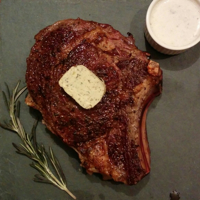 Стейки жарим по 3 минуты с каждой стороны, чеснок после второго поворота можно убрать, он все своё отдал. Добавляем грамм 20 сливочного масла и жарим ещё по 2 минуты каждую сторону. Огонь между средним и максимальным.