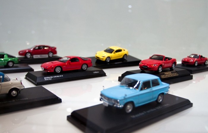 Многие модели представлены в миниатюре. Вижу на заднем фоне довольно популярную RX-8.