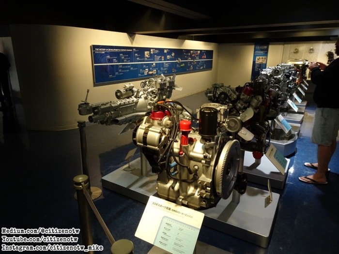 Следующий зал музея посвящён истории двигателей Mazda. Mazda очень гордится своими роторными движками: экскурсовод рассказывала о них бОльшую часть времени, которое мы находились в данном зале (да и в целом на экскурсии). Конечно, всех характеристик я не запомнил, но если среди вас есть эксперты - можете накинуть информации в комментариях.