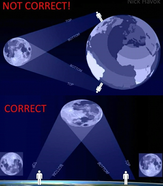 Сторонники шарообразной Земли часто утверждают, что поскольку Луна кажется перевернутой при наблюдении из северного полушария и перевернутой при наблюдении из южного полушария, это является неопровержимым доказательством сферической формы Земли. Они считают, что наблюдатели, стоящие в южном полушарии вращающегося шара, буквально находятся вверх ногами относительно наблюдателей на севере, и что это единственная возможная причина, по которой Луна может казаться перевернутой при наблюдении из противоположных полушарий. Однако любой может легко опровергнуть это неубедительное утверждение самостоятельно, просто приклеив изображение Луны к потолку и посмотрев на него с противоположных сторон комнаты. Луна будет казаться перевернутой при наблюдении с одного конца комнаты и перевернутой при наблюдении с другого. Для объяснения этого простого явления не обязательно, чтобы вся комната была сферической, и не обязательно, чтобы наблюдатели стояли физически вверх ногами относительно друг друга.