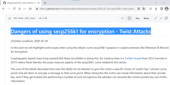 Не так давно пакет elliptic (6.5.4) для стандартных эллиптических кривых был уязвим для различных атак, одним из которых является Twist Attack. Криптографическая проблема была в реализации secp256k1. Нам известно что криптовалюта Биткоин использует secp256k1 и эта атака не обошла Биткоин стороной, согласно уязвимости CVE-2020-28498 подтверждающие стороны транзакции алгоритма ECDSA через определенные точки на эллиптической кривой secp256k1 передавали частичные значение приватного ключа (более простые подгруппы состоящие от 5 до 45 bit )