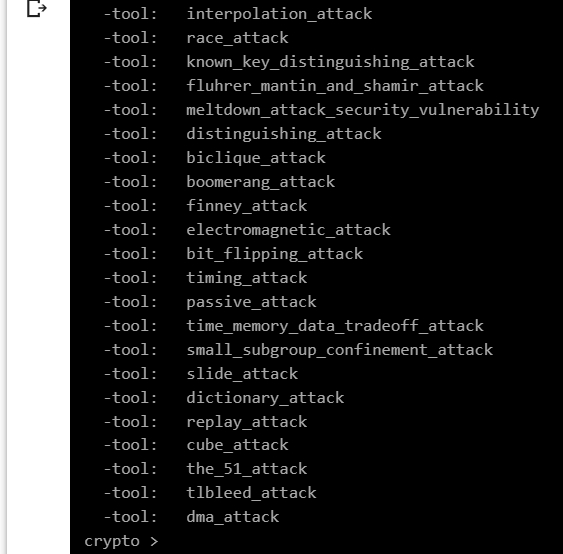 -version: software version -list: list of bitcoin attacks -tool: indicate the attack -gpu: enable gpu -time: work timeout -server: server mode -port: server port -open: open file -save: save file -search: vulnerability search -stop: stop at mode -max: maximum quantity in mode -min: minimum quantity per mode -speed: boost speed for mode -range: specific range -crack: crack mode -field: starting field -point: starting point -inject: injection regimen -decode: decoding mode