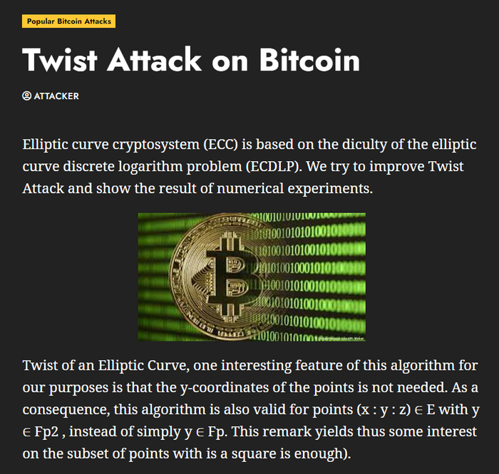 В этой статье мы реализуем Twist Attack на примере и покажем как с помощью определенных точек на эллиптической кривой secp256k1 мы можем получить частичные значение приватного ключа и в течение 5-15 минут восстановить Биткоин Кошелек используя “Sagemath pollard rho function: (discrete_log_rho)” и “Chinese Remainder Theorem”.