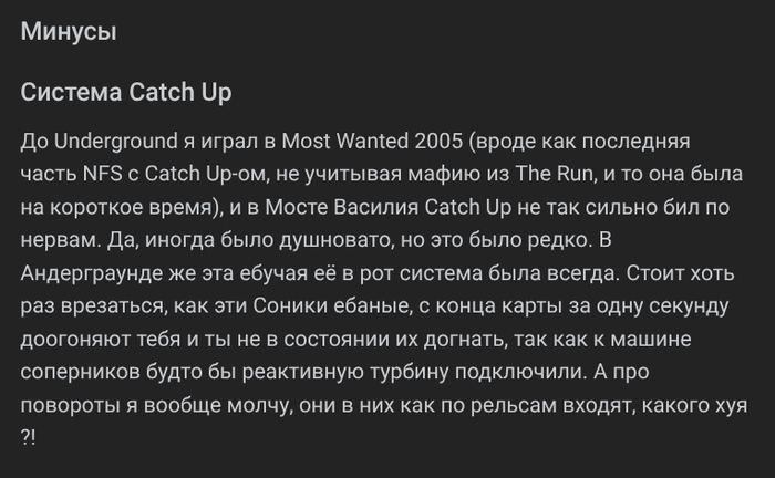 От себя. Игрушка классная, дрифт больше нравился. Читая комментарии узнал (в свои 35) про систему кетчуп, сука! Я так бесился, что никак не мог пройти, сейчас на пк играю в драйвер 2, бешусь тоже, может попробовать нфс1 пройти если есть вариант отключить эту херню?! ))