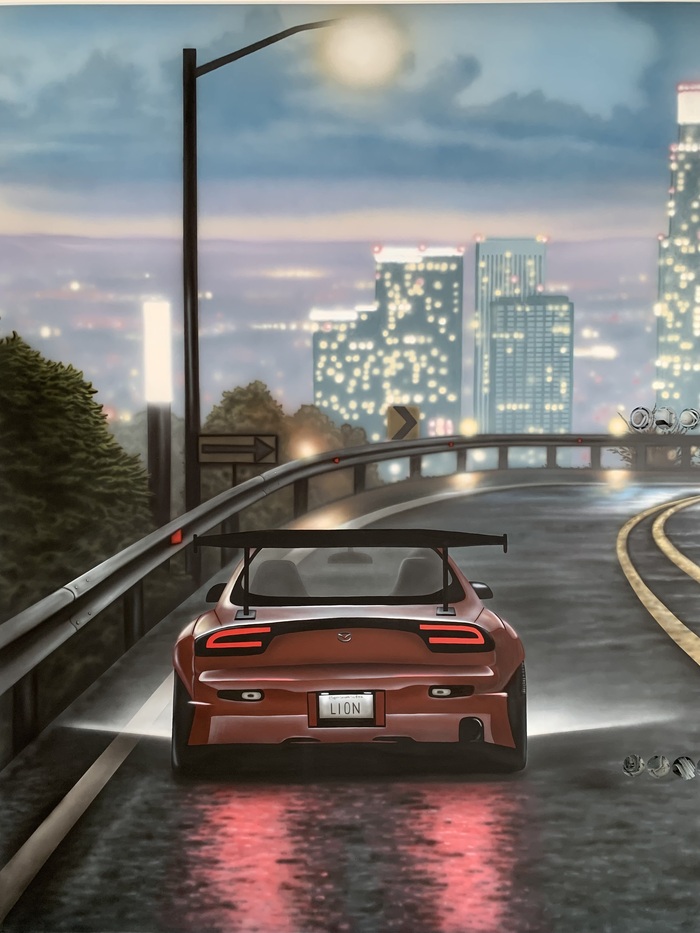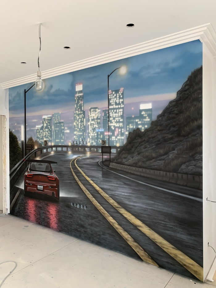 Я немного обыграла её с учётом того, что здесь будет стоять консоль и телевизор, в частности было решено изобразить левосторонее движение – чтобы мебель не закрыла основные элементы рисунка.