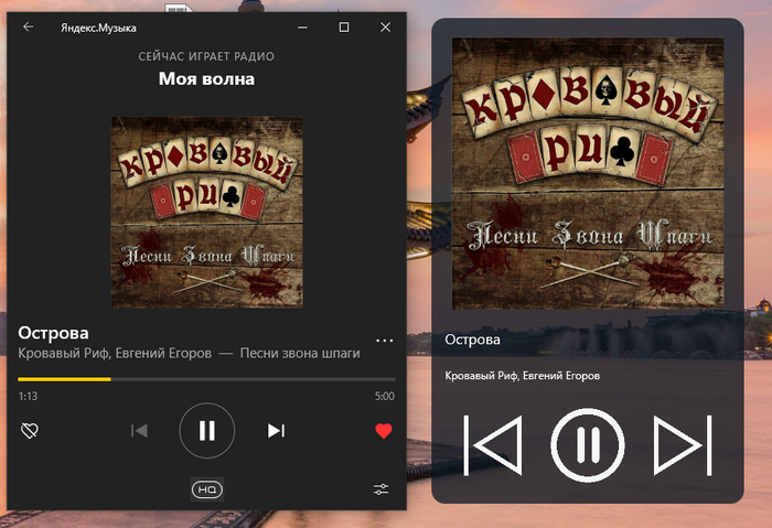 Первый виджет является обычным вызываемым окном через панель значков винды, который показывает название трека, исполнителя и обложку и 3 кнопки, две их которых отвечают за переключение треков, и одна соответственно pause\play.