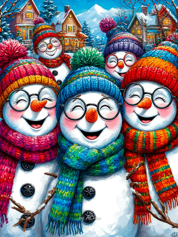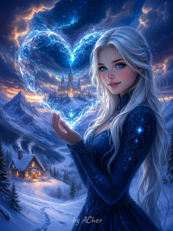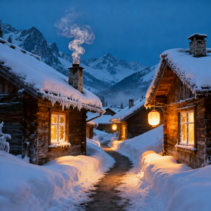 Промт: A winter mountain village at dusk, nestled among snow-covered slopes. Thick snowbanks line the narrow paths between wooden houses, their roofs heavy with frost. Warm light glows from small windows, contrasting with the deep blue evening sky. Thin columns of smoke rise from chimneys, drifting slowly into the cold air. Lanterns cast soft halos on the snow, and distant peaks fade into twilight, creating a cozy, quiet atmosphere of shelter and warmth amid the winter cold.