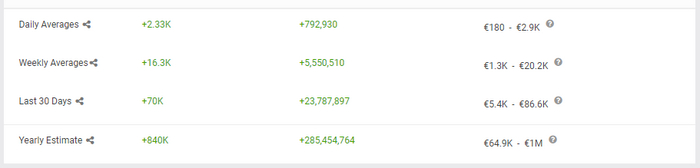 Но да это ещё не всё. Нам ведь надо узнать, сколько людей включают Рика Эшли ежедневно! Можно было бы просто поделить все просмотры видео на количество дней, получить около 280 тысяч просмотров в сутки, но...это неверно, потому что если мы обратимся к тому же СошиалБлейду, мы увидим средние значения за последние месяцы: