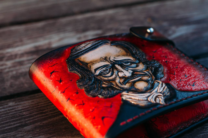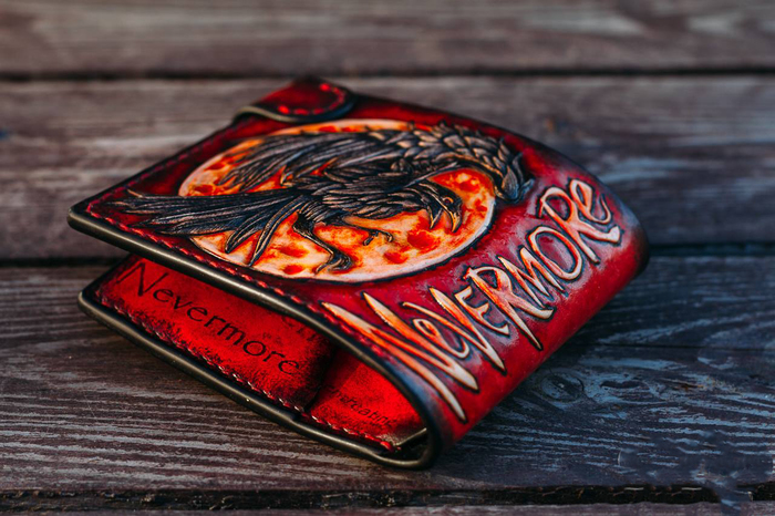Сделал кое-когда себе кошелек, вдохновленный любимым лирическим произведением: "Nevermore" авторства Эдгара Аллана По. Итак, рисунки вытиснены на коже, расписаны спиртовыми красками и акрилом. На внутренних деталях нанесены отрывки со стиха методом лазерно-утюжной печати. Фоток с процесса толковых нет(