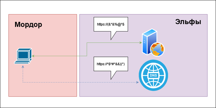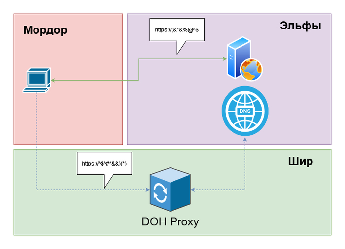 Саурон приказал своему орккомнадзору фильтровать эти запросы, записывать их и, в некоторых случаях, подменять. То есть Саурон не видит, что хоббит делал на сайте, ведь там протокол HTTPS, но вот какие сайты хоббит запрашивал — он видит. А если хоббит захотел открыть эльфийский сайт, то можно в DNS запросе подменить ответ и хоббит вместо эльфийского сайта увидит злобную картинку от орккомнадзора. Или просто обвинить хоббита в сочувствии и поддержке эльфов, признать его эльфоагентом. Тогда мудрые эльфы придумали протокол DNS-over-HTTPS (сокращенно DOH). Это когда DNS-сервер прикидывается обычным веб-сервером, работающим по протоколу HTTPS, и интернет-браузер хоббита запрашивает у этого сервера IP-адреса сайтов по зашифрованному протоколу.