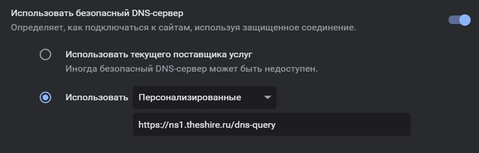 В Google Chrome открыть Настройки -> Конфиденциальность и безопасность -> Безопасность -> Использовать безопасный DNS-сервер вписать сервер также, как это указано выше для Firefox. У нашего хоббита это получилось так: