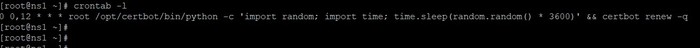 echo "0 0,12 * * * root /opt/certbot/bin/python -c 'import random; import time; time.sleep(random.random() * 3600)' && certbot renew -q" | tee -a /var/spool/cron/root > /dev/null