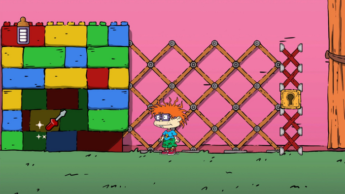 На эти двух механиках и держится вся игра. На этих двух механиках и завязан выбор персонажей. Всего в игре четыре играбельных персонажа взятые прямиком из мультфильма. томми, Чаки, Лил и Фил. Каждый персонаж отличатся от друг друга высотой прыжка и дальностью броска предметом. Плюс заметил, что у той же Лил, за которую я и прошёл всю игру есть дополнительная жизнь в самом начале, что значительно упрощает жизнь в игре. Так же в игре можно переключаться между персонажами во время прохождения, если только выбрана не трудная сложность.