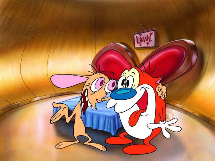 Данный приём тоже не нов - это мы видели в мультсериале Джона Крисфалуси. До него собаки и кошки всегда конфликтовали друг с другом, никогда не появлялись в мультфильме в качестве комедийного дуэта - до этого в годы Золотого Века анимации США в сюжете короткометражек было либо два пса, либо два кота. Из примеров приходит на ум эпизод из Merrie Melodies под названием "A Gruesome Twosome /Ужасная парочка" 1945 года, где коты с большими носами и послужили прообразом персонажа Стимпсона/Стимпи.