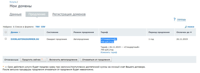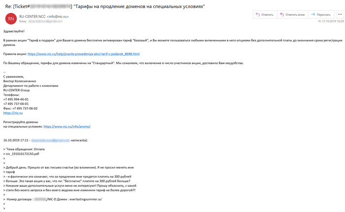 В RU–CENTER начали действовать тарифы на продление доменов, которые позволяют при продлении имени выбрать дополнительные опции и сервисы для администрирования домена. В рамках акции для вашего домена имядомена.ru на договоре НОМЕРДОГОВОРА/NIC-D бесплатно активирован тариф «Базовый».
