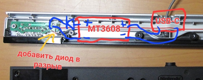 Есть везде, стоит 100₽, и самое главное - она влезла в оригинальный корпус sensor bar! Да, пришлось немного подпилить напильником кабель каналы и стенки закрывающие внутреннее пространство, но получилось вполне цивильно! Я добавил пару диодов(1N5819): один на выход MT3608 и один на вход оригинального кабеля wii, таким обрзаом сделав защиту от дурака(даже если подключить и питание по USB и подключить кабель к wii ни приставке, ни блоку питания USB, ни самому бару ничего не будет) и получив устройство которое будет работать как с оригинальной консолью так как это задумывал разработчик, но и добавив к ней USB-C при работе без оригинальной консоли. К сожалению, фоток процесса у меня не сохранилось, да и мои навыки пайки далеки от идеала, но я набросал схему для тех кто захочет это повторить:)