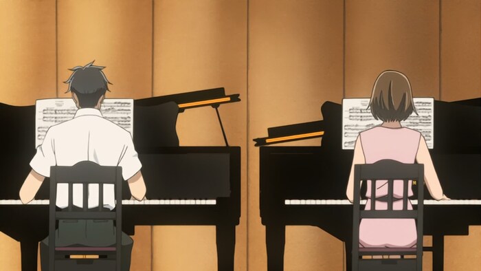 Начнём с того что тут не навязанная романтика. Да, главный герой и Мегуми быстро сближаются, но явных намёков нет. Молодого дирижёра интересует лишь возможность учиться у маэстро. А девушку - только играть на пианино и понравится самому Чиаки. Романтика прослеживается лишь в конце и то мимолётом. Конечно, тут есть милые моменты, когда он беспокоится о ней что та заболела, или защищает от хейта. Но в целом это радует, что нет притянутой за уши романтики.