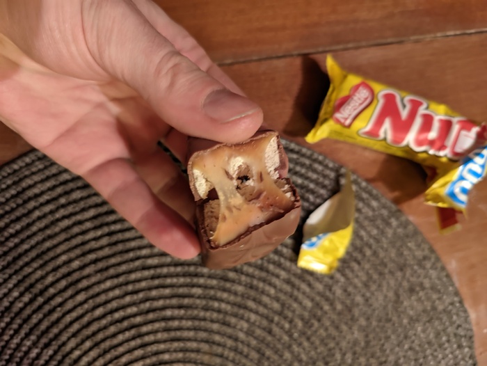 Купил я значится конфеты NUTS в пятёрочке. Конфета была полностью запакована. А внутри вот такое. Я в ахуе.