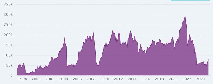 При этом пика мы достигли в 2021 году, почти дотянувшись до отметки в $300 млрд. После этого всё как-то резко пошло не очень.