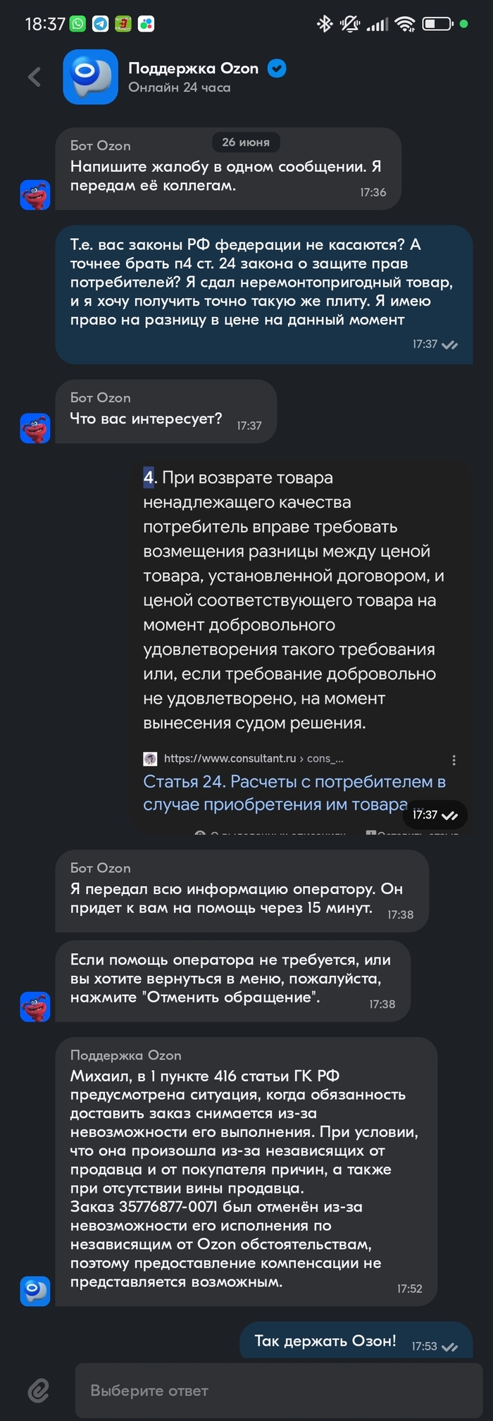 Ozon. Производит двоякое впечатление. На знаки "Оригинал, Качество, Продавец отвечает ртом", внимание не обращаю, ибо та же ситуация, что с ВБ. Но хотя бы возвраты оформляют. Заказываю все реже из за логистических проблем и отмен заказов. Ну пусть едет вещь неделю или две, но зачем отменять? Ладно бесило когда продавец давал супер скидку и потом отменял товар предлагая заказать дороже и Озон был на его стороне, пока досудебка не прилетит, тогда уже говорили по другому. Но вот, берем инструмент за 1300, продавец отменяет заказ через неделю и он появляется через день в продаже за... 1100... Заказал пару раз повторно, все пришло, я в замешательстве.