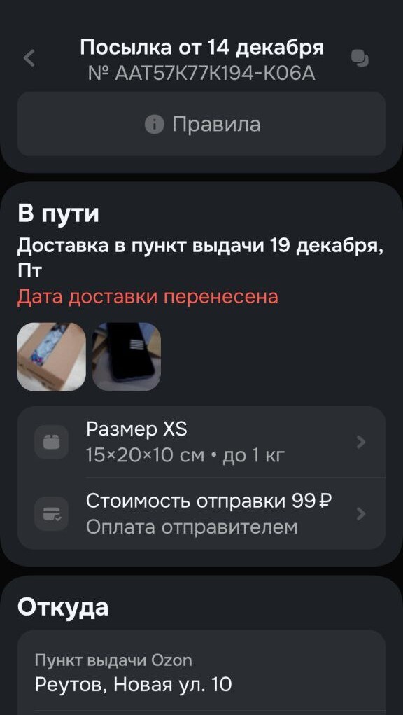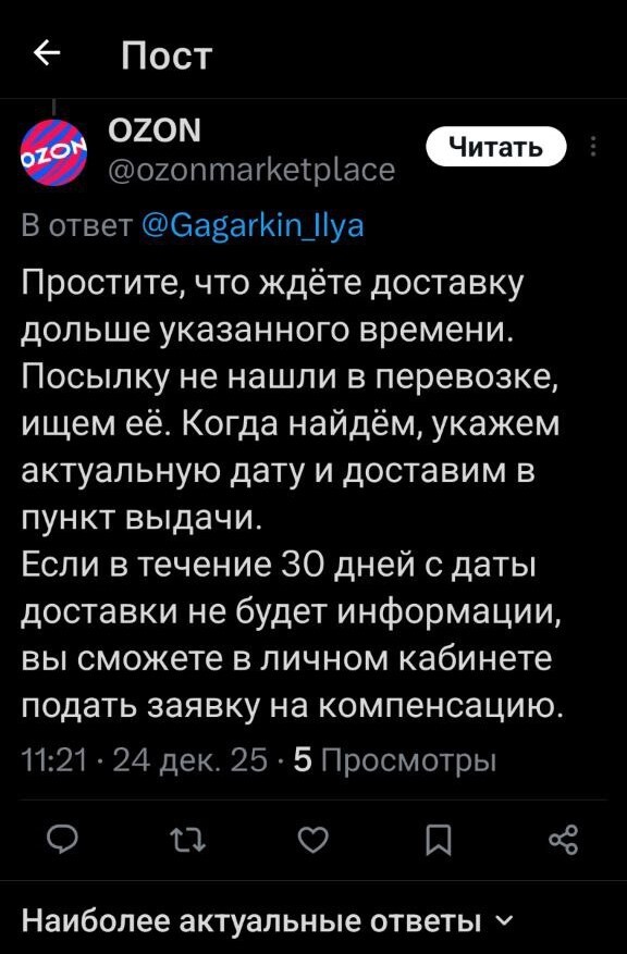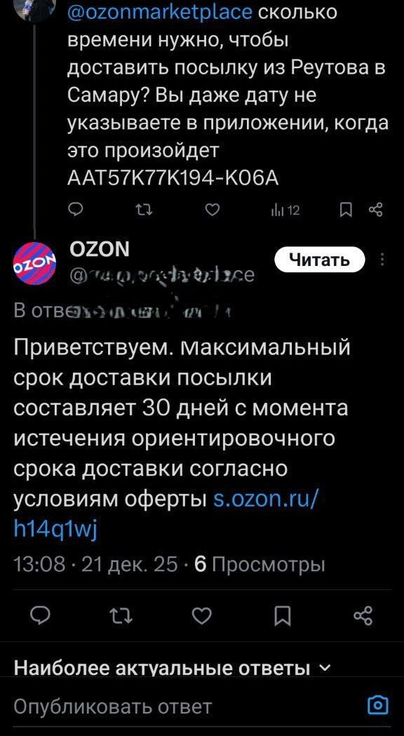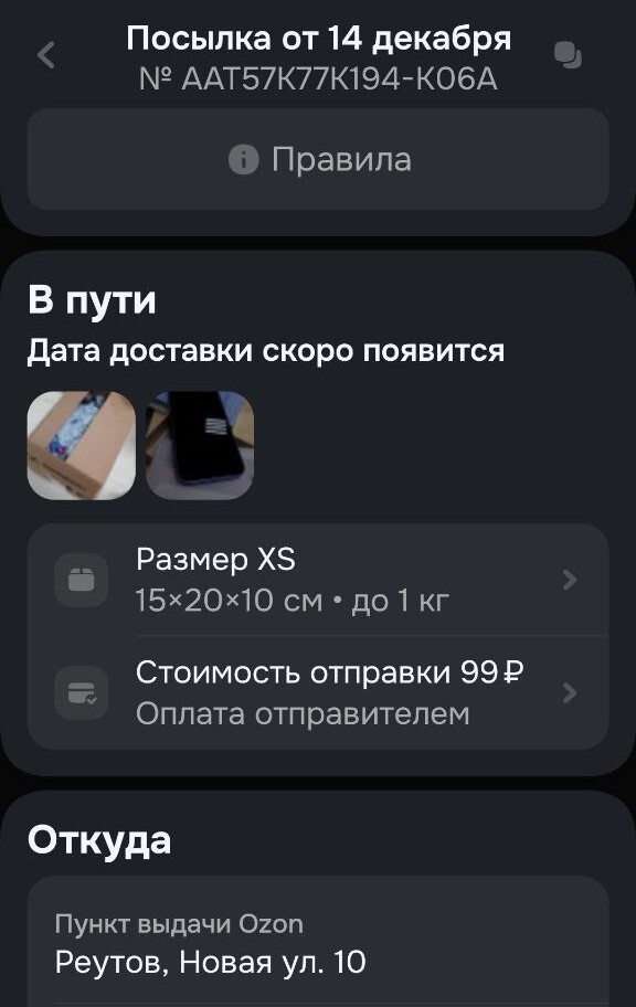 14 декабря мне из Москвы в Самару была отправлена посылка к Новому году с вложением в виде нового смартфона Pixel 9a. Прицел был на оперативность, на опыте полученной посылки парой неделей ранее, и стоимость в пределах ста рублей. ну и удобство в виде огромного количества пунктов выдачи. Посылка №ААТ57К77К194-К06А. В приложении Озон у меня она сразу же появилась с датой доставки 19 декабря, и примерно сразу же появилась приписка - дата доставки переносится. Показалось странным, но внимание не заострил. 19 декабря дата доставки пропала и статус поменялся на "Дата доставки скоро появится". попытался написать в поддержку, но все общение в чате ограничивается стандартными ответами бота и оценкой результата. По телефону горячей линии - то же самое. оказалось, что у поддержки Озон есть аккаунт в запрещенном в РФ Х. написал им туда. ответа не последовало, хотя было видно, что с другими клиентами общение там происходит. Написал еще раз и получил прекрасный ответ - ждите 30 дней с момента предполагаемой доставки, то есть 19 декабря +30 дней. Именно в этот момент я понял, что никто ничего искать не планирует и свой подарок я уже не получу. Написал им в третий раз и получил подтверждение, что посылку мою потеряли. Больше ответов от озона я не получал.
