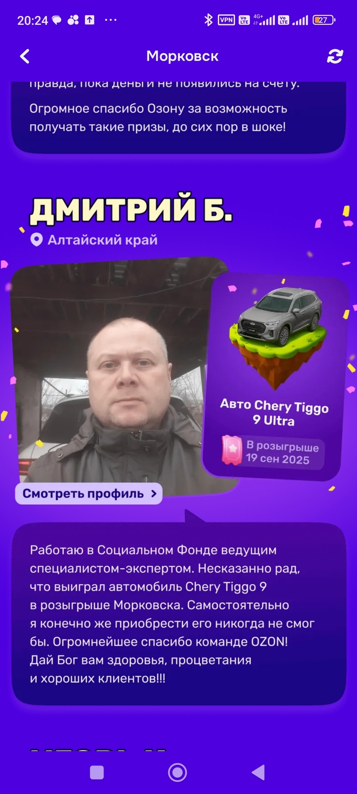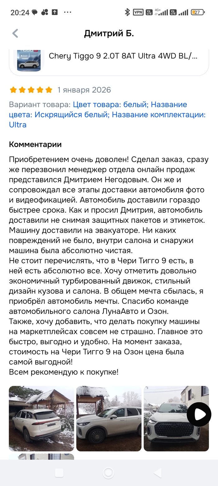 Каков результат розыгрыша автомобиля Черри Тиго? Его выиграл Дмитрий Б.! Он сердечно благодарит команду Озона за выигрыш. А что мы увидим, заглянув на его страницу? Отзыв на покупку автомобиля Черри Тиго.