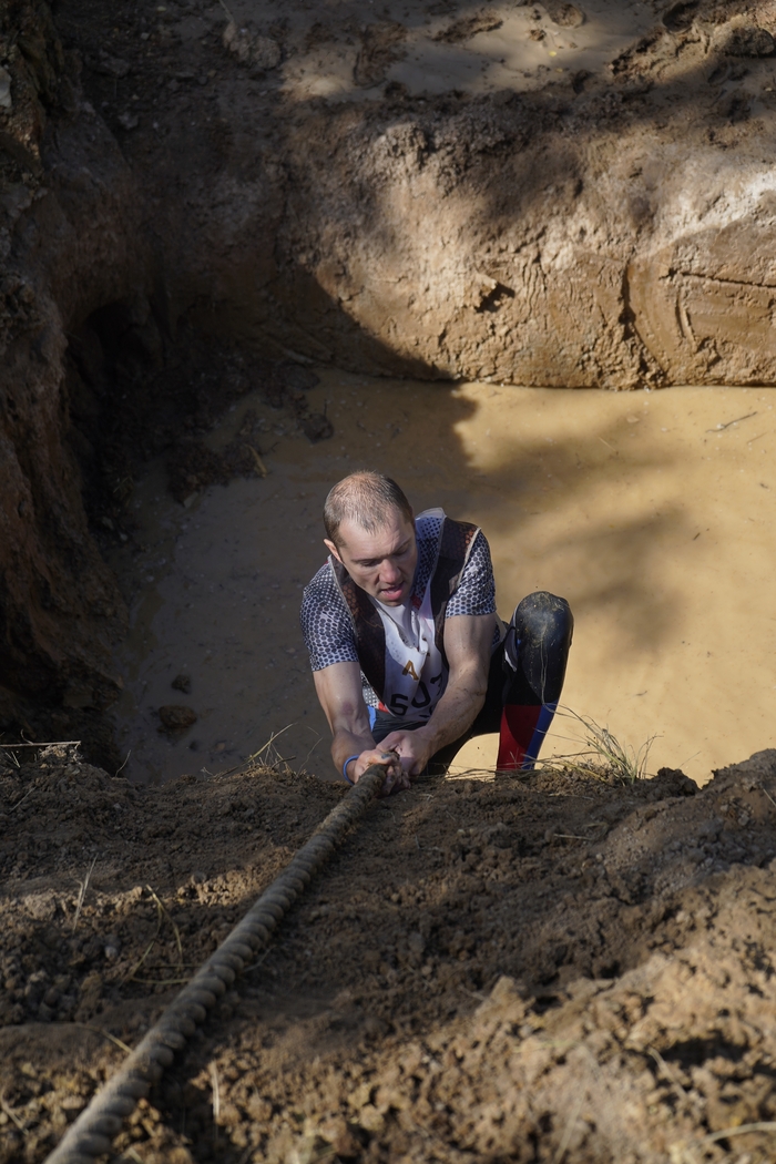 И сразу же одно из сложных препятствий. О чудо! Начинается дождь: если до этого он немного капал, то теперь он уже начинает показывать свой характер. Все, кто проходили до меня, уже успели намочить это препятствие. У меня с собой была влажная спиртовая салфетка, которой я вытер руки насколько мог и начал быстрое прохождение. Хватом у меня всё было в порядке, но буквально через секунду я уже лежал на мате — просто соскользнул. Понял, что так пройти не получится. Пошёл быстро вытирать руки перед вторым заходом и понял, что нужно применить технику: хватом тут не помочь. Я просто немного медленнее, но увереннее преодолел это препятствие.