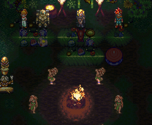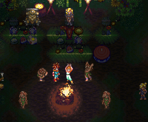 Друзья поначалу немного теряются, особенно Робо, который не знает, что нужно делать. Однако принцесса зовёт Хроно потанцевать, раз уж выпала такая возможность, и они позволяют ритму барабанов увлечь себя в пляс.