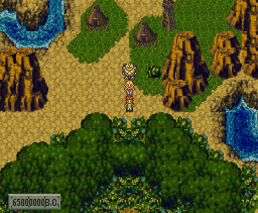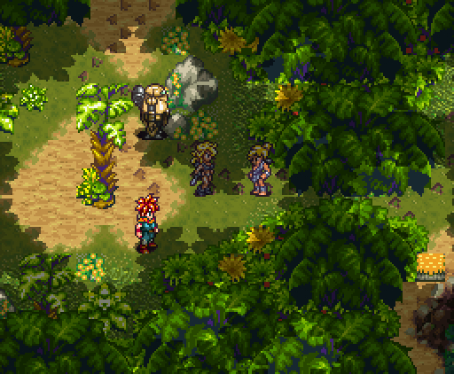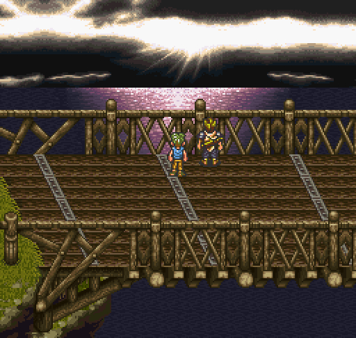Еда здесь отменная: сочные куски мяса, поджаренного на углях, и здоровенная рыба... Насытившись, Хроно замечает, что Марл уже о чём-то живо беседует с Эйлой, прихлёбывая какую-то жидкость. Обе то и дело смеются, поглядывая на него.