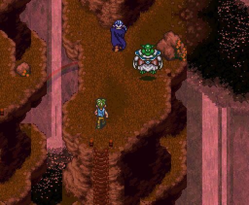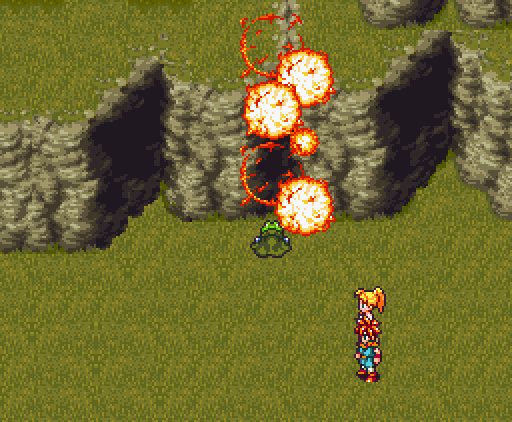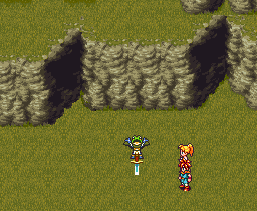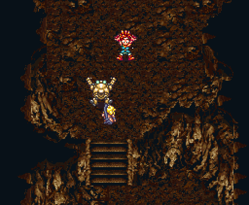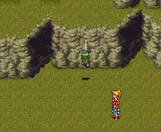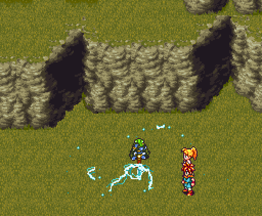 Внезапно незнакомка бросается на Хроно и прижимает его к скале. Принцесса испуганно взвизгивает, но кажется, дикая женщина просто решила обнюхать его и немного пощупать. Наконец, она отступает и встряхивает головой, поправляя свои взлохмаченные волосы. Похоже, что она уже успокоилась.