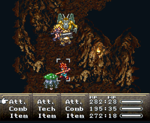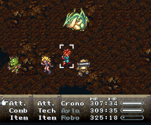 Когда она и её жертва скрываются из виду, оставшиеся динозавроиды вновь концентрируют своё внимание на троице пришельцев. Тогда Робо берёт Хроно за ноги и начинает кружиться, а тот, выставив перед собой багровый клинок, летит, рассекая пространство вокруг.