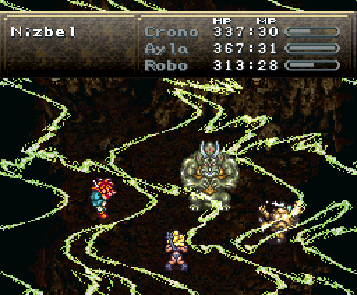 Низубел оказывается настолько силён и проворен, что его почти не берут ни удары, ни меч, ни даже лазер. Но Хроно, зная уязвимость рептилий, оглушает его магической молнией. Это позволяет героям отыскать его уязвимые места, но тут Низубел, подобно гигантскому конденсатору, разряжает полученную электрическую энергию, поражая своих противников. Однако других вариантов нет, приходится терпеть и повторять то же самое вновь. В конце концов, героям удаётся смертельно поразить оглушённого монстра.